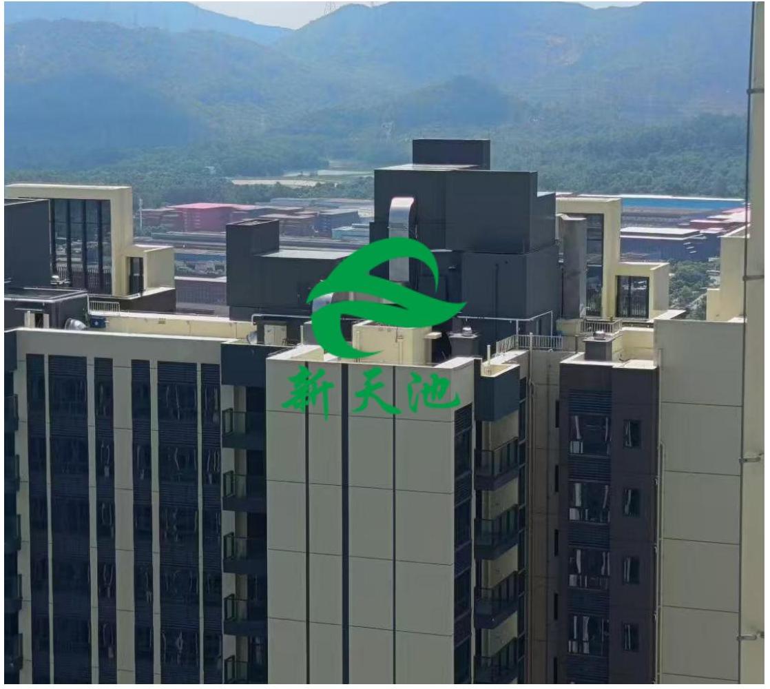 項(xiàng)目概況:項(xiàng)目位于深圳市坪山區(qū),該排油煙風(fēng)機(jī)安裝在裙樓和塔樓屋面上。目前該項(xiàng)目共安裝有二十三臺(tái)排油煙風(fēng)機(jī),這些風(fēng)機(jī)在正常運(yùn)行時(shí)電機(jī)風(fēng)扇轉(zhuǎn)動(dòng)會(huì)產(chǎn)生一定量的風(fēng)噪聲與壓縮機(jī)運(yùn)行噪聲,運(yùn)行引起的噪聲造成周圍的環(huán)境惡化。客戶特邀我們新天池環(huán)保進(jìn)行降噪治理。